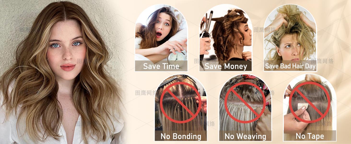 • 4. Time - saving beauty : Skip the salon visits ! Our hair extensions clip ins with user - friendly clips , they can be attached to your natural hair quickly and securely . Effortlessly transform your hairstyle in minutes and remove without any damage . Boosting your hairstyle without spending hours and hundreds in salon.